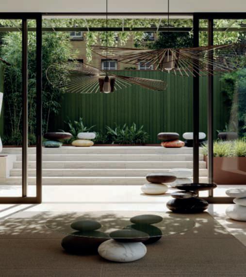 Lecollezioni Keir e Pavé,ispirate aciottolilevigatiesovrapposti disegnatedaEnzoBerti,offrono seduteecoffeetabledalleforme morbideenaturali.Inmarmoe legno, ruotano intorno al perno per assumere varie configurazioni.