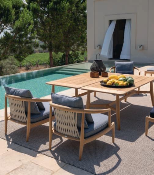 Lacollezione TheSecret Garden di RobertoLazzeroni è in massello di teakafinitura naturale.Glischienalihanno unintrecciodifettuccepiattein fibradipolipropilene,lesedute sono in doghe di legno.