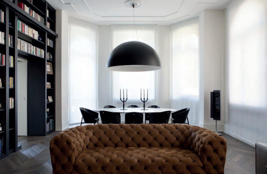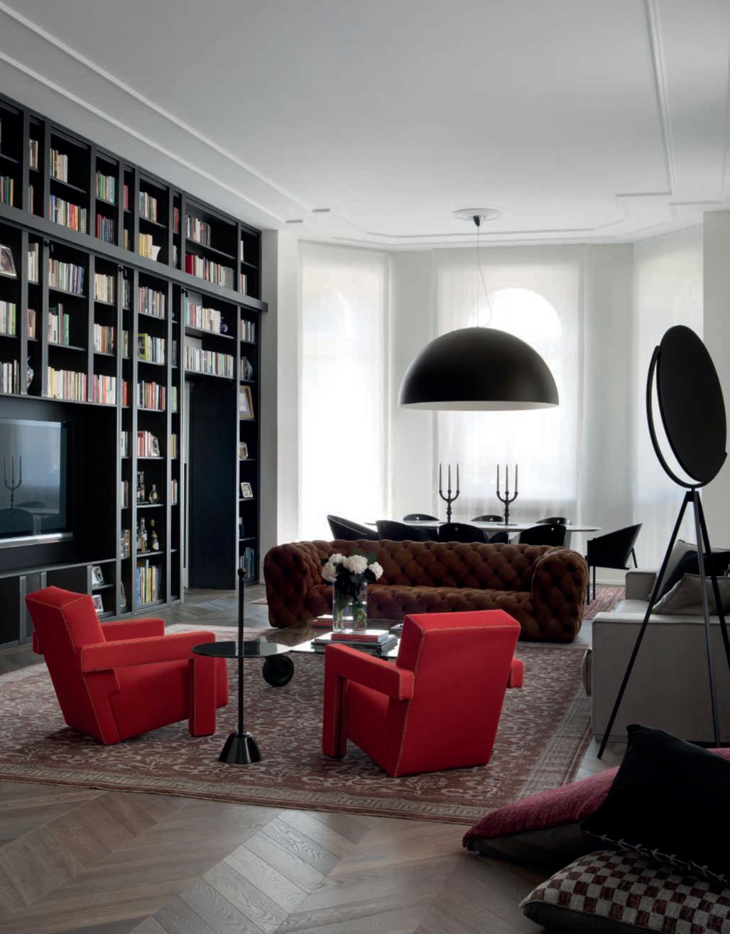 versone grigia. La lampada daterraè Superloon di Flos, lepoltroncinerosse Utrecht di Cassina.Tavolino Servomuto disegnato daAchille Castiglioni per Zanotta Tappetidi Battilossi. La libreria sumisuraèstatarealizzata sudisegnoVemworks