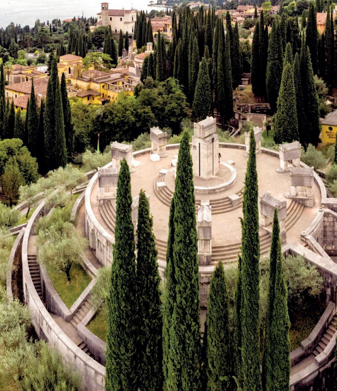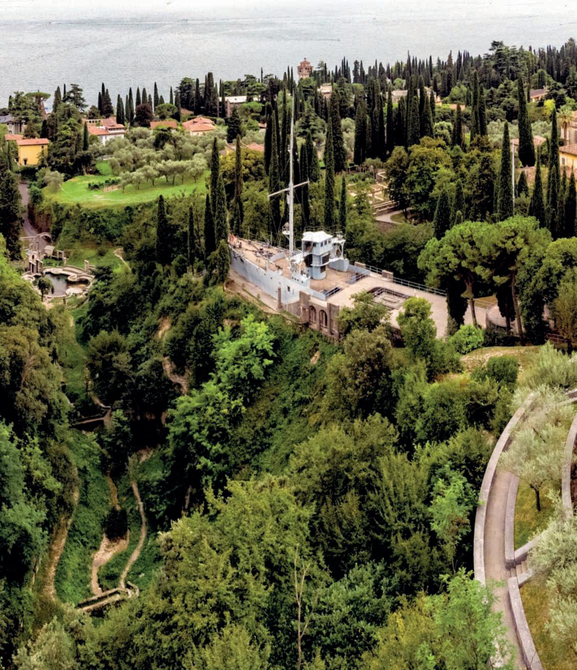 On these pages,a viewof IlVittoriale from its highest hill, known as the Mastio orColleSanto,wherethe Mausoleo is located,ahighly evocative place wherethe Poetrests, moved fromthe TempiettodelleMemorie in1963,togetherwithhis faithfulcompanionsandGian CarloMaroni.Completedafter 1938,itfollowsthemodelof Roman tumulus tombs,with threestonecircles.Alittle furtherdown,the RegiaNave