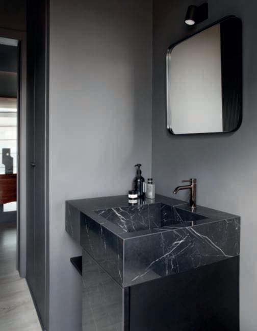 Onthispage,above,right,the masterbedroom with quilted boiseriethatbecomesthe headboardofthebed(designed by DainelliStudio);next to the bed,a1940smodernistbedside tablewithabrassframeand marble top; bespokewardrobe inanthracitelacquer.Above, oneofthetwobathroomswith washbasinandvanityunitin black-stainedash. ArtisStilo model faucets inblacknickel and Dioscurilamp by Artemide Below,thesecondbathroomwith custom-madewashbasincovered in black Marquiniamarbleand ArtisStilo model faucets in blacknickel.