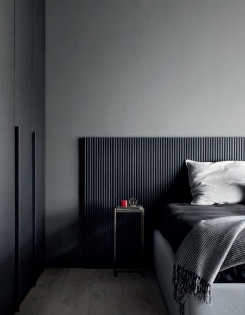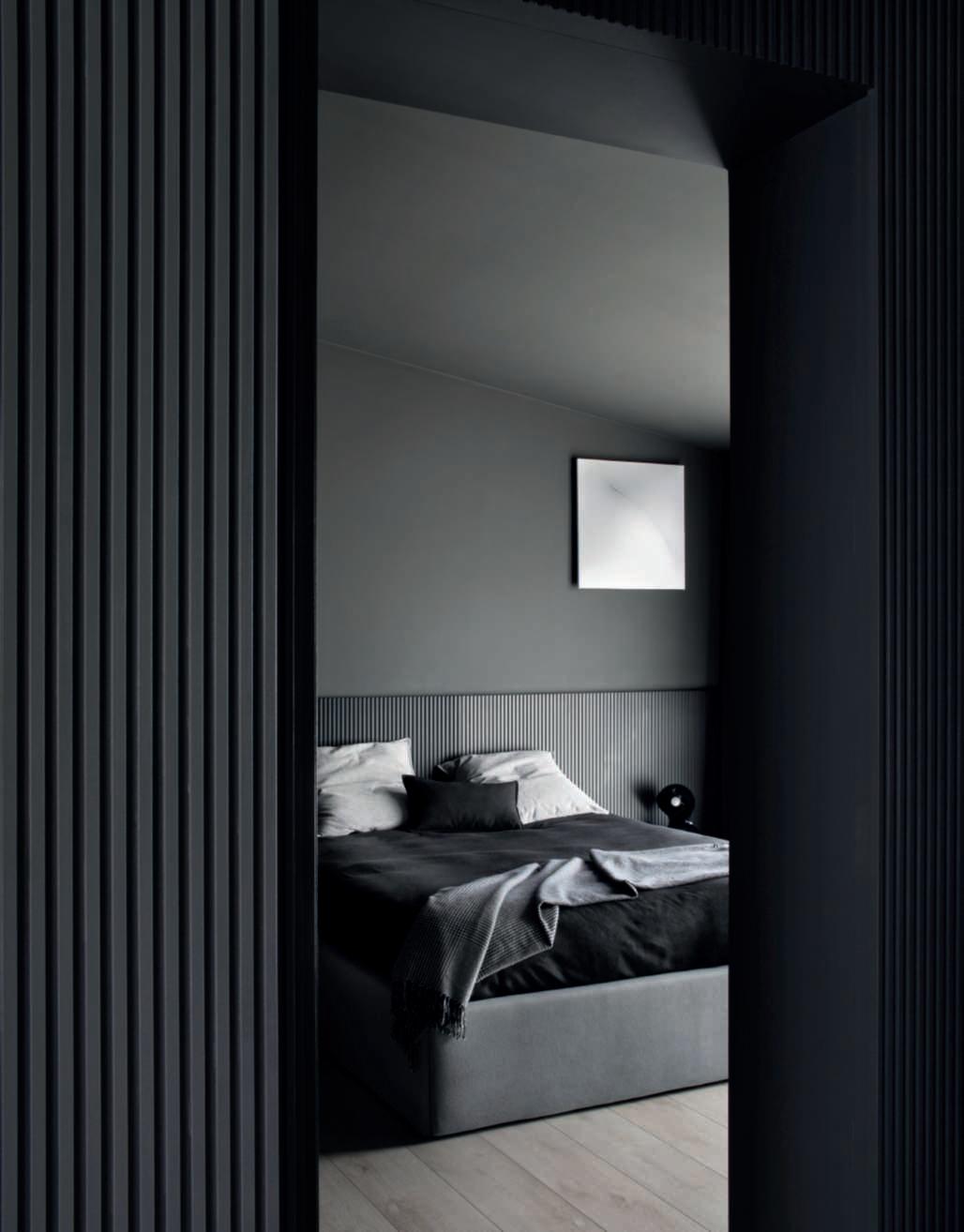 nero cherivesteleporteelepareti, nella camerapadronale diventa testata per ilsommier intessutolinoantracite