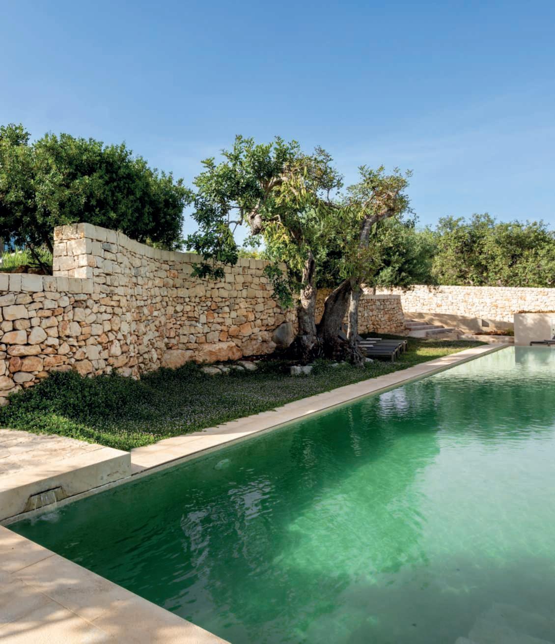 On these pages,the natural swimmingpool with a 20-metrelongby3.10-metre widepool,whereswimming intotalprivacywhileenjoying thepleasureof waterthathas not been treated with any chemicalagent, as purification iscarriedoutwithspecial aquaticplants intheadjacent pondandtransferredintothe pool via a hidden circulation