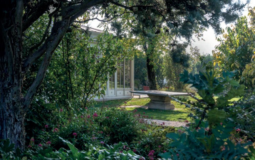 Onthispage,above,aglimpse ofanotherpartofthegarden of VillaAmagioia, in frontof oneofthetwoverandas,with Cydoniaoblonga (quince) trees;below,adetailofthe large vegetable garden with dahlias and Cosmos bipinnatus. On the right page, above, a view ofthe Pagoda, an octagonalconstruction neartheVilla;below,aviewof theareaoutsidethesecond veranda.