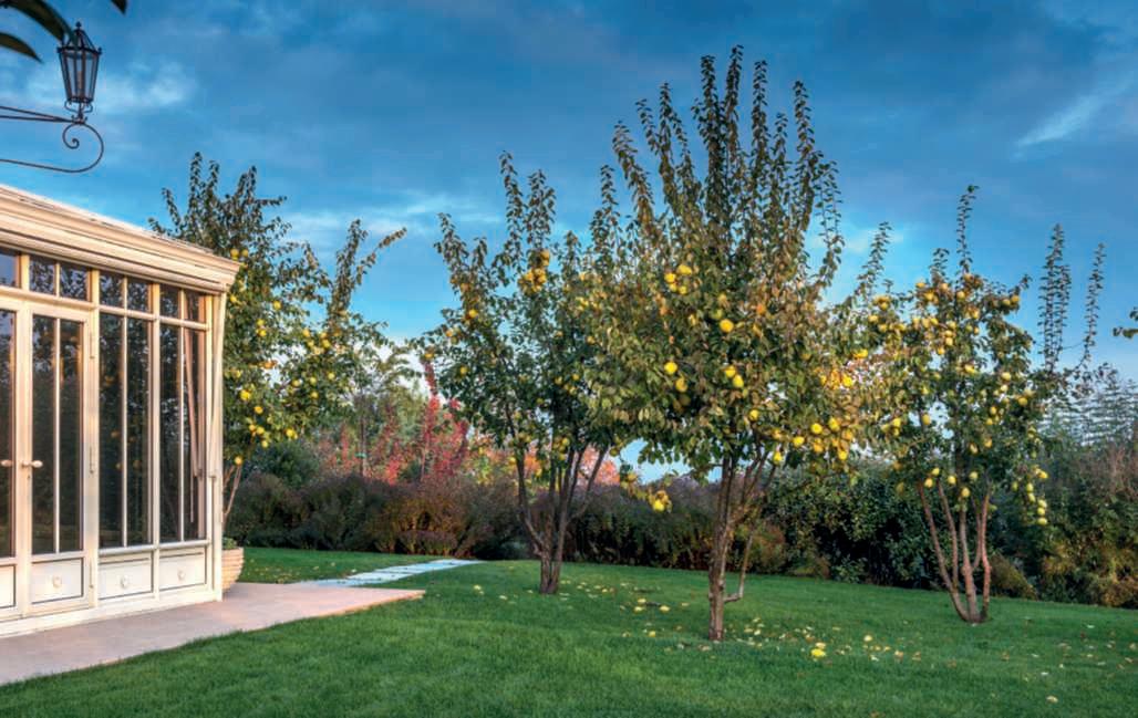 Inquestapagina,inalto,uno scorciodiun’altrapartedel giardinodi VillaAmagioia, davantiaunadelledue verande,conalberidi Cydonia oblonga (cotogno);inbasso, undettagliodell’ortogrande con dalie e Cosmosbipinnatus. Nella pagine di destra,in alto,unoscorciodella Pagoda, una costruzioneottagonale vicinoallaVilla;inbasso,una vistadell’areaesternaalla secondaveranda.
