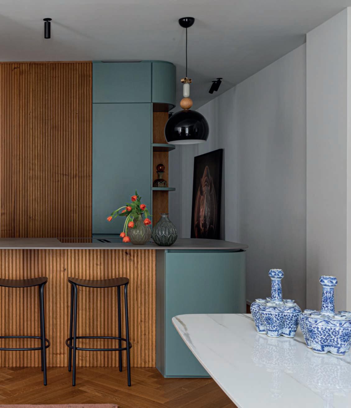Onthepreviouspages, someroomsofthe en de n thesepages,thekitchen openontothelivingroom basedonadesignby iaa in collaborationwith FalegnameriaBuila,with Florim worktop,lacquered wooddoorsandboiserie andcustomlacquered mouldings.Suspended overthekitchentopisthe bonton lamp by IlFanale Trick stool by Scabdesign Completingthelivingroom furnishings is the Shade tableby Lema illuminated bythe nabila lamp by Tooy Atthecentreoftheroom theiconic Utrecht armchair by Cassina ona1930s