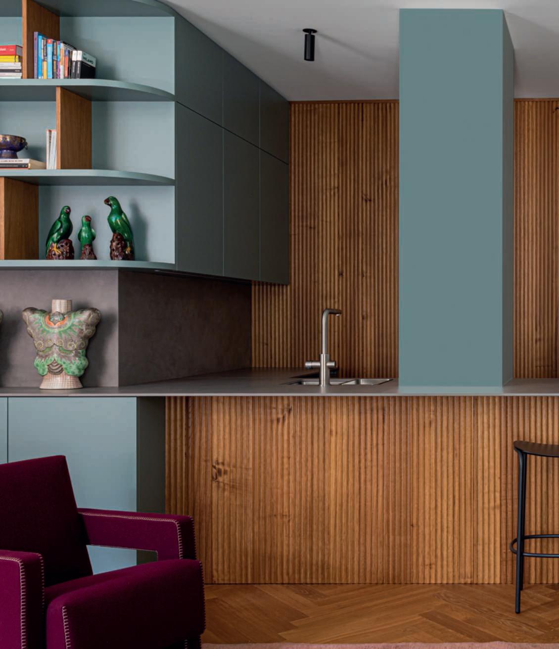 Nelle pagine precedenti alcuni ambienti dell’ “appartamentopromenade”.Inquestepagine,la cucinaaperta sul soggiorno sudisegno iaa in collaborazionecon Falegnameria Buila, con piano Florim, ante e boiserie in legno laccatoelistellisagomatia misura e verniciaticustom. Sospesasulpianocucina lalampada bonton de Il Fanale.Sgabello Trick di Scabdesign Completanol’arredodel soggiorno il tavolo Shade di Lema illuminatodalla lampada nabila di Tooy Alcentrodell’ambiente l’iconicapoltrona Utrecht di Cassina sutappetodi antiquarioanni30.