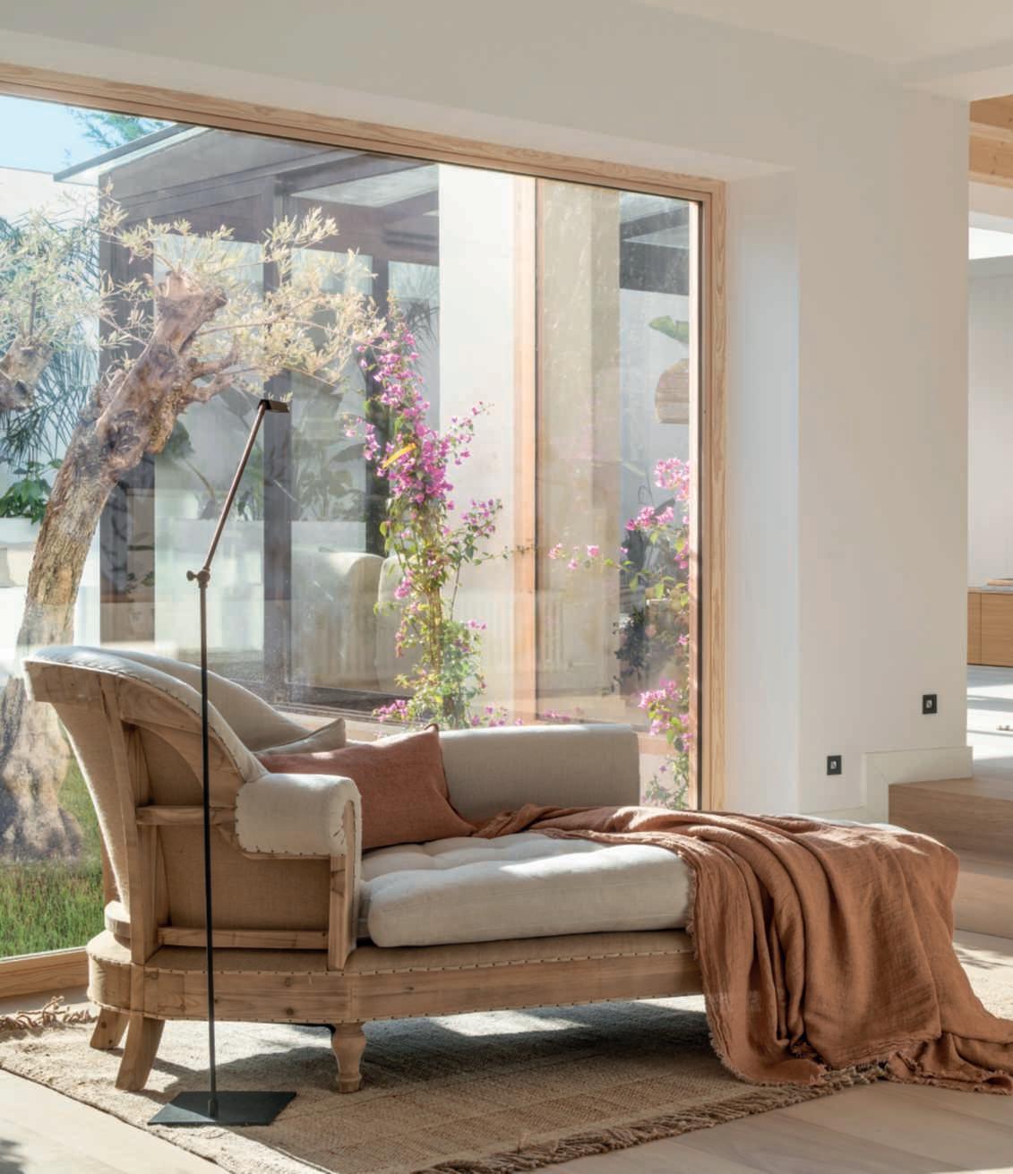 Materiali e tintenaturali dominano gli interni della villa diGirona, in Spagna, pensatida SusannaCots per aprirsiversol’esterno edentrarein dialogoconi colorivivacidelgiardino