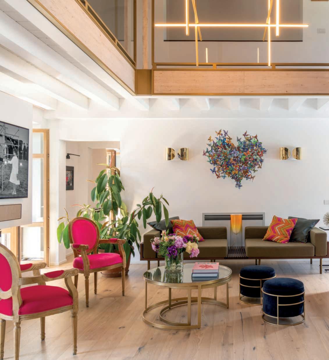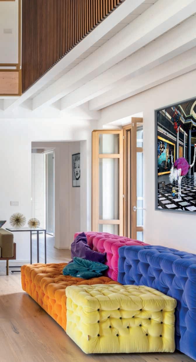 In queste pagine,lâampio livingspace con divanomulticolor La Michetta disegnato da GaetanoPesce per Meritalia abbinatoa cusciniEtro Aparetelâopera Myheartis allafutter di DavidKracov acquistataalla EdenGallery a Soho accanto alla quale sono stateposizionatedue applique Foglio di Flos