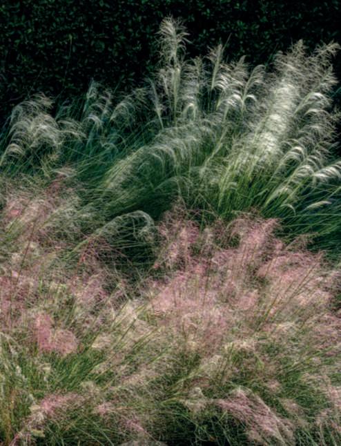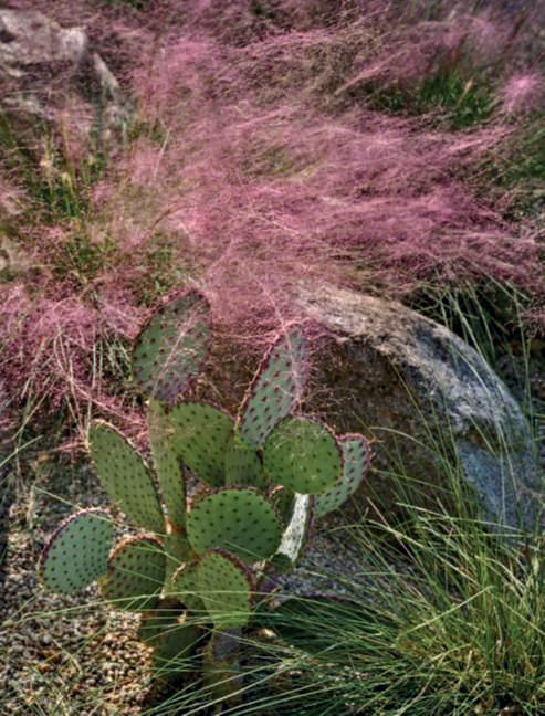 On this page,theexuberant Muhlenbergiacapillaris âPink Cloudâ infullbloom,mixed withcacti,includingprominent specimensof Lophocereusmarginatus and Alluaudiaprocera, beneath Parkinsoniaaculeata trees, and in the background, two ashin tonia li era.On theleftpage,above, Opuntia gosseliniana andMuhlenbergia capillarisâPinkCloudâ;below, Muhlenbergiacapillaris âPink Cloudâ and M. c. âWhiteCloudâ Inthepreviouspages,thegarden viewedfromthe pedestrian accesspath,formedby parallelogram-shapedconcreteslabs
