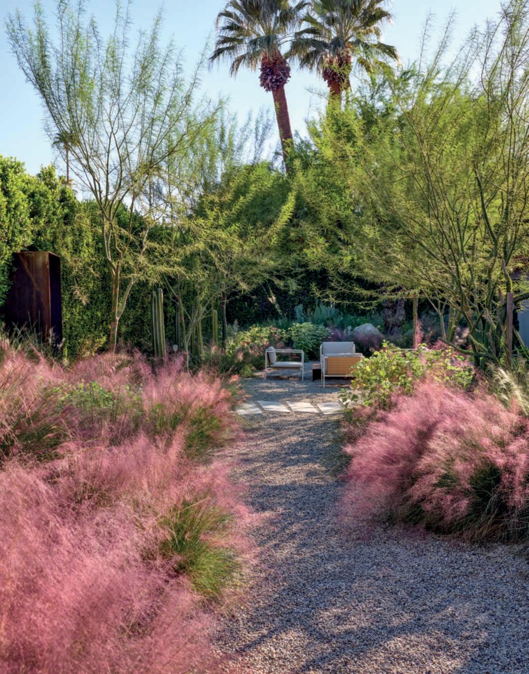 In questa pagina,lâesuberante Muhlenbergiacapillaris âPink Cloudâ in piena ďŹorituramixata acactacee, tracuispiccano Lophocereusmarginatus e Alluaudiaprocera,sotto alberi di Parkinsoniaaculeata e sullo sfondo due Washingtonia li era. Nella pagina di sinistra, in alto, Opuntiagosseliniana e Muhlenbergiacapillaris âPink Cloudâ; in basso, Muhlenbergia capillaris âPinkCloudâ e M.c. âWhiteCloudâ.Nellepagine precedenti,vistadal vialetto pedonalediaccesso costituito dalastredicementoaformadi parallelogramma