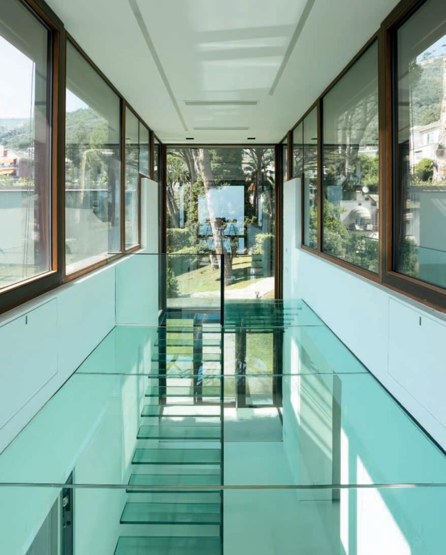 foors made oflaminatedglass panes,developedinasingle wall-to-wallelementallowinga view the levels el w