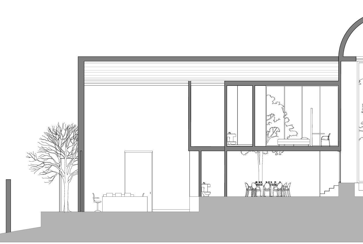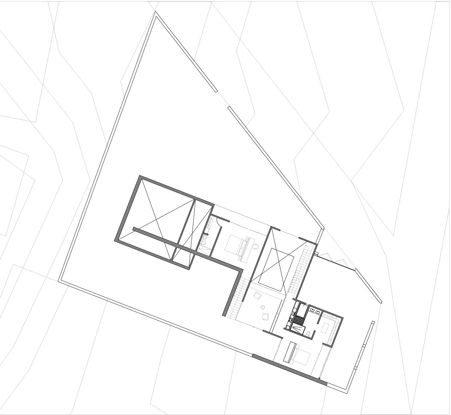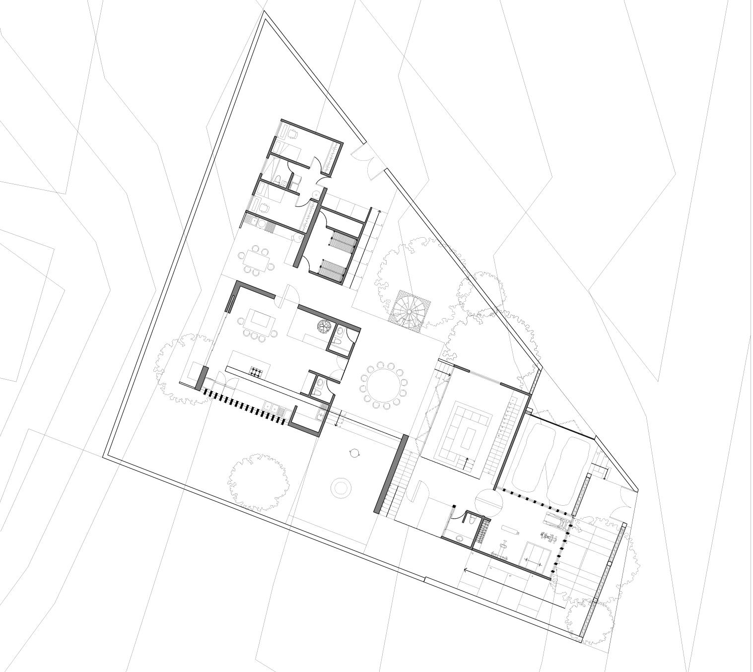 La arquitectura se organiza en estratos adaptados a la pendiente natural del terreno, utilizando la sección como herramienta principal de diseño. En lugar de imponer una plataforma artificial, el proyecto se escalona, permitiendo que cada nivel dialogue con el paisaje y genere vistas controladas.