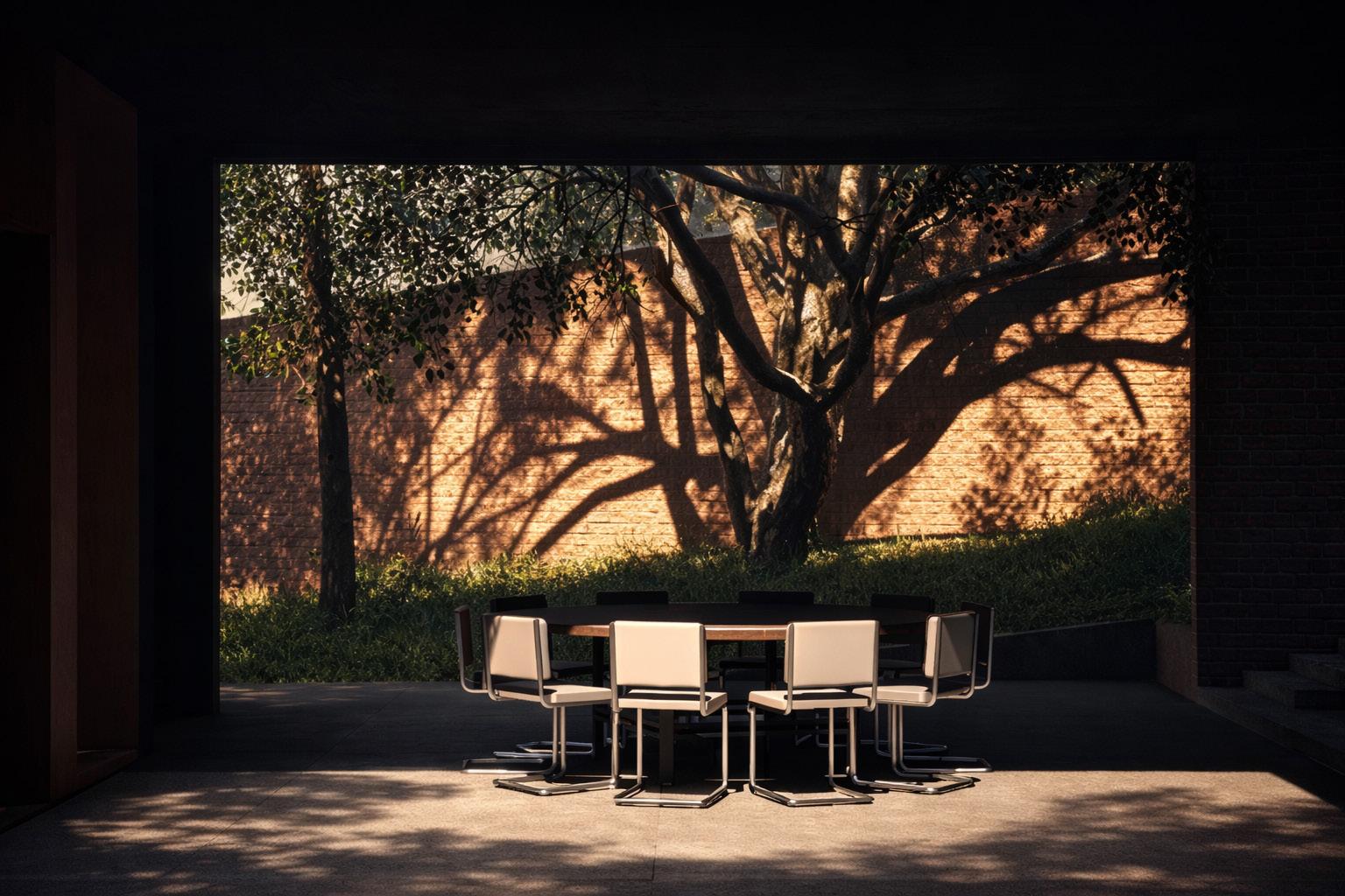 La zona de degustación se concibe como un espacio intermedio entre lo doméstico y lo público, donde la experiencia culinaria se integra con la arquitectura a través de iluminación natural controlada, materialidad cálida y una relación directa con el exterior.