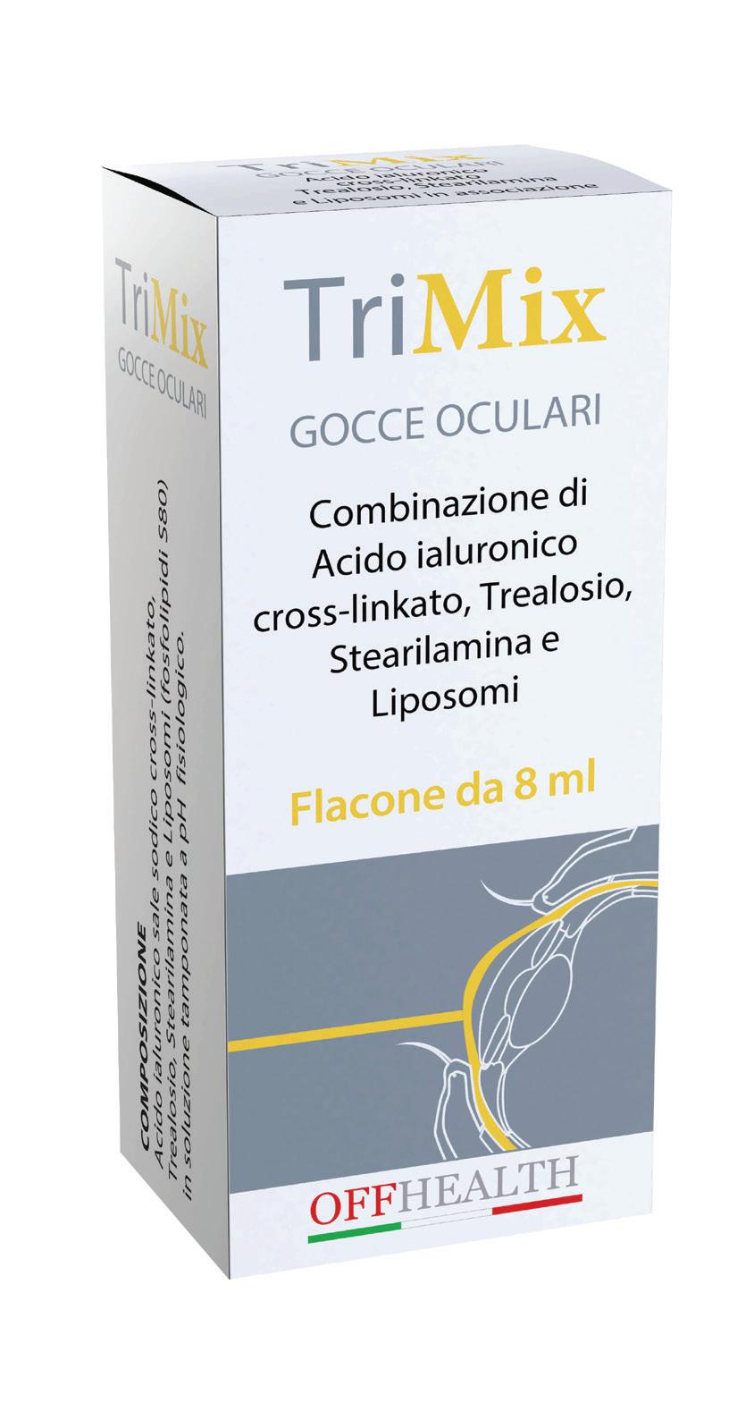 IIn un occhio sano, il film lacrimale ed i suoi componenti lavorano in COMBINAZIONE per lubrificare, ossigenare, nutrire, idratare e proteggere la superficie oculare. La stabilità del film lacrimale, che è un segno distintivo di un occhio sano, è minacciata quando le interazioni tra i componenti sono compromesse da una ridotta secrezione, iper-evaporazione o alterata composizione della lacrima; conseguenza di tutto ciò, sarà l’infiammazione oculare e il danno epiteliale. Una COMBINAZIONE di molecole che operano in SINERGIA per ricostituire tutti gli strati del film lacrimale e interagire con l’epitelio della superficie oculare, può essere di ausilio nel semplificare la gestione e il trattamento dell’occhio secco. TriMIX è una COMBINAZIONE AD AZIONE MULTIPLA a base di Acido Ialuronico cross-linkato, Trealosio, Stearilamina e Liposomi, formulata per il ripristino delle proprietà fisiologiche della superficie oculare.