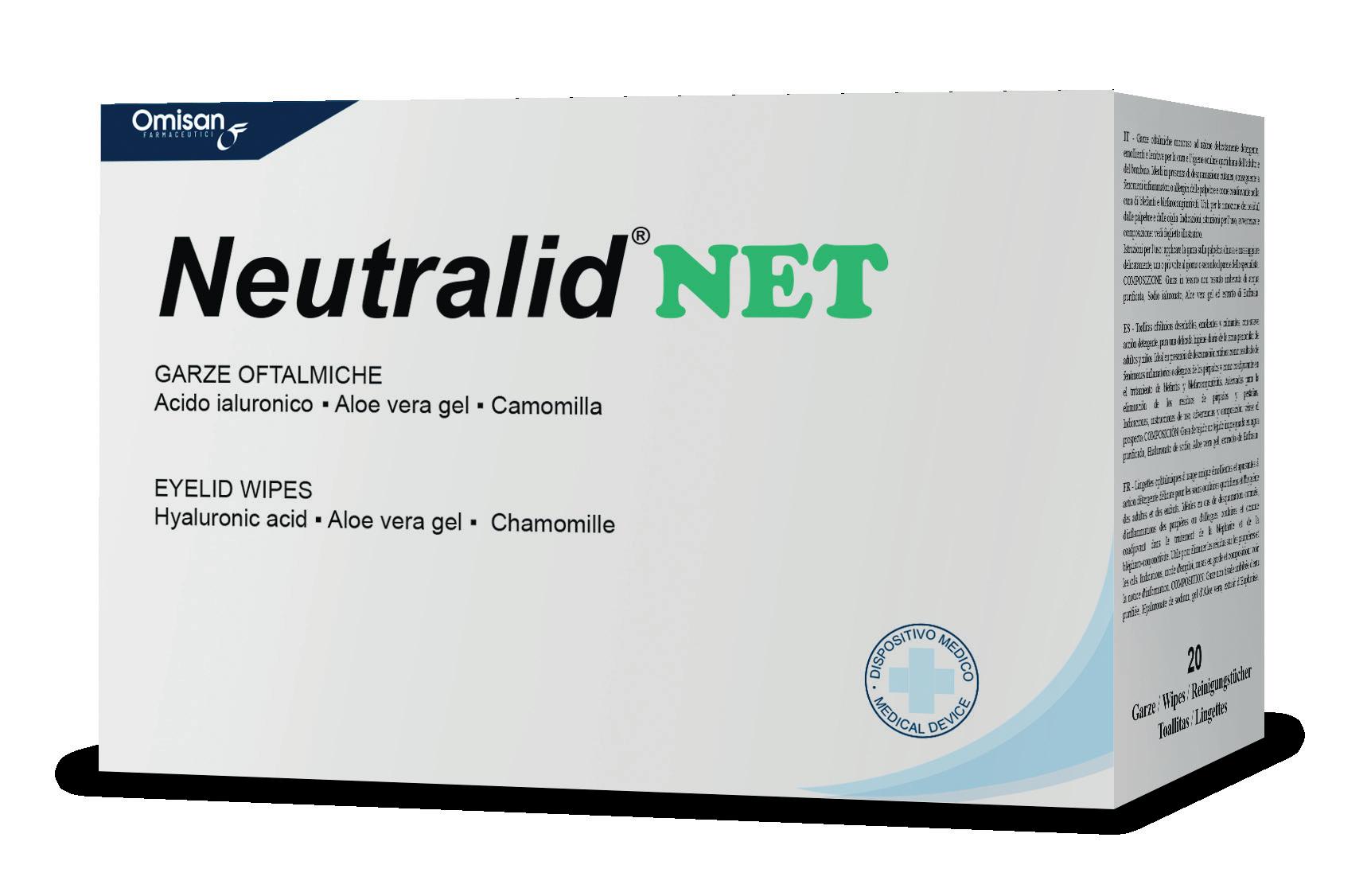 è senza dubbio l’uso di garze monouso, opportunamente medicate. Le garze oftalmiche monouso Neutralid NET, sono realizzare con tessuto non tessuto (TNT) attraverso un processo definito “Spunlace” che potenzia la struttura reticolare delle fibre componenti il fazzoletto, evitando che questi disperda filamenti, o altri residui, e che sia resistente all’azione meccanica prodotta dal loro uso. Queste caratteristiche strutturali facilitano il corretto utilizzo della garze Neutralid NET senza produrre una pur minima sofferenza della cute palpebrale né irritazione. Le garze sono imbevute di Sodio ialuronato 0,10%: una molecola naturale con particolari capacità plastiche ed idratanti che produce sulla cute una azione di modica imbibizione, rendendola morbida e trofica anche per la caratteristica di trattenere acqua e riportando ad un giusto equilibrio la trama del tessuto cutaneo in tutte le sue componenti. Le proprietà mucomimetiche e mucoadesive facilitano una attività riepitelizzante, ma anche blandamente antiinfiammatoria