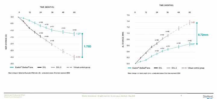 anno di sperimentazione clinica. Dai dati è emerso che le lenti Essilor® Stellest® hanno rallentato in media la progressione della miopia di 1,75 D*1 e l’allungamento assiale di 0,72 mm**1 nell’arco dei cinque anni per tutti i soggetti rispetto al gruppo di controllo che utilizzava lenti monofocali. Lo studio ha quindi fornito evidenze definitive sull’efficacia delle lenti nel rallentare ogni anno fino al quinto anno la progressione miopica nei bambini. I dati hanno inoltre dimostrato che l’efficacia sia nel rallentare la progressione della miopia che nell’allungamento assiale si è mantenuta anche nei bambini più grandi (fino a 18 anni). I soggetti che hanno completato il quinto anno di studio avevano infatti un’età compresa tra 13 e 18 anni.
