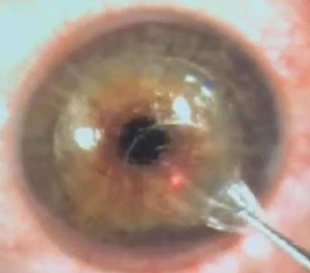 Figura 1. Dopo la creazione del lenticolo con software CLEAR e la dissezione con spatola delle 2 interfacce, il lenticolo stromale integro viene estratto con serrafili dall’unica microincisione.