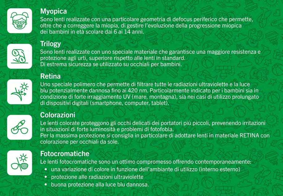 intuitivi e facilmente comprensibili da parte dei professionisti della visione e dei genitori, migliorando la trasparenza e l'accessibilità delle informazioni sui prodotti. Le iconografie coprono vari aspetti, tra cui la protezione UV, la resistenza agli urti, la leggerezza, l'adattabilità fotocromatica e altre proprietà specifiche.
