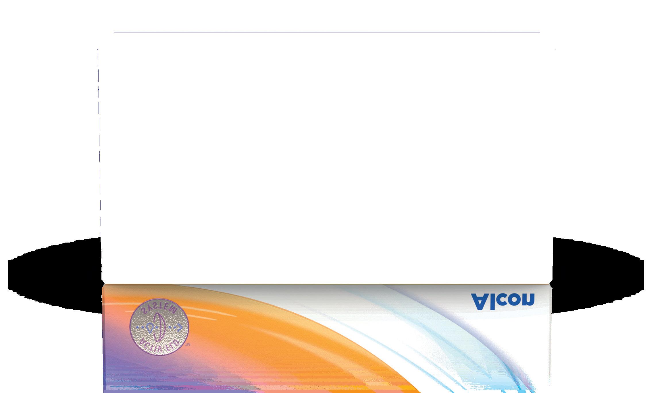 Referenze: 1. Zheng Y, Dou J, Wang Y, et al. Sustained release of a polymeric wetting agent from a silicone-hydrogel contact lens material. ACS Omega.2022;7(33):29223-29230. doi: 10.1021/ acsomega.2c03310. 2. Phan CM, Chan VWY, Drolle E, et al. Evaluating the in vitro wettability and coefficient of friction of a novel and contemporary reusable silicone hydrogel contact lens materials using an in vitro blink model. Cont Lens Anterior Eye. 2024. (p<0.05) Based on simulated 7-day daily wear. Lenti a contatto correttive. Dispositivi medici CE0123. Per l’utilizzo, la manutenzione, le precauzioni, le avvertenze, le controindicazioni e gli effetti indesiderati, consultare le istruzioni d’uso. Visitate il sito Alcon https://ifu.alcon.com/ per importanti informazioni di prodotto. ©2026 Alcon. IT-PR7-2600001