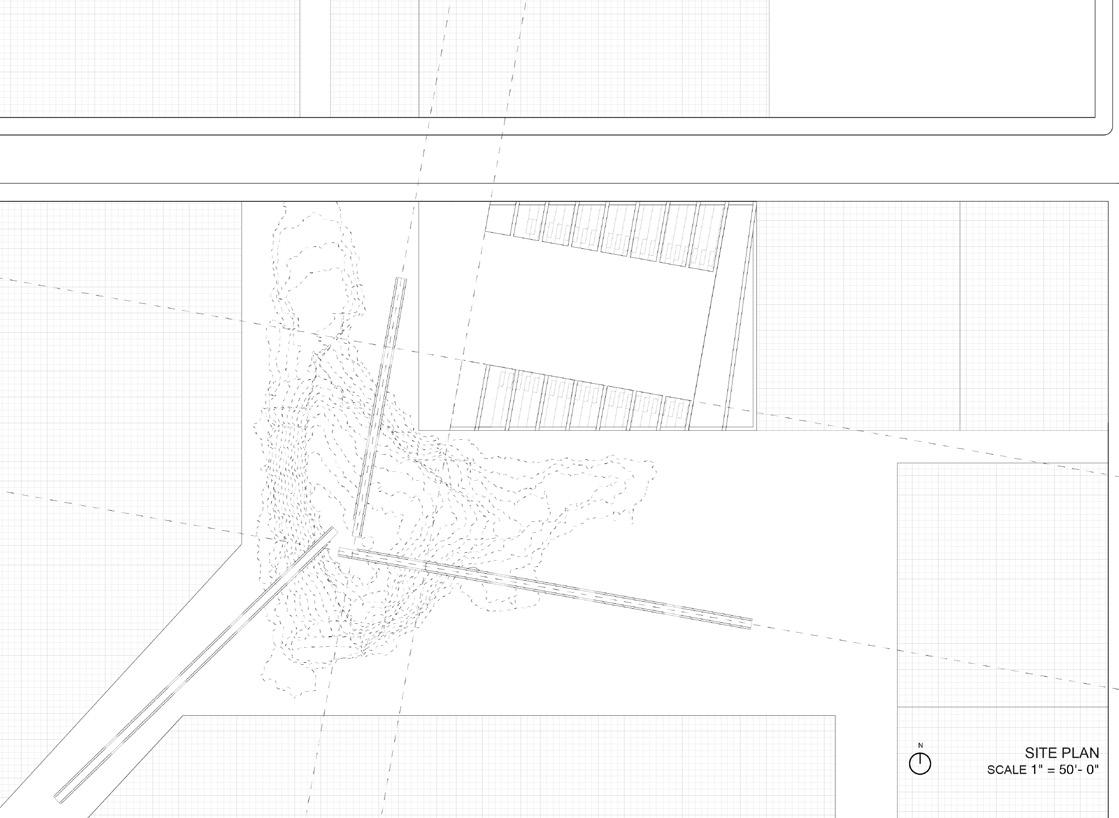 Referencing Guillaume Amat’s Open Fields, where mirrors on scaffolding reconstruct territory and create double interpretations, a translation model was formed as a rectilinear mass cut by sloping planes that converged on a reflective center, its surfaces extending outward as channels. From this, a pavilion at Pier 70’s Irish Hill emerged, where ramps and mirrored scaffolding projected outward, pulling visitors into shifting perspectives. The approach became the greyscape an in-between condition, always almost there, never absolute with mirrors multiplying that ambiguity. The language then extended into an archive library, organized by an offset grid of the pavilion’s geometry, where ramps unfolded as multifunctional staircases and mirrored thresholds deepened the greyscape, binding movement, memory, and shifting perceptions of knowledge and history.