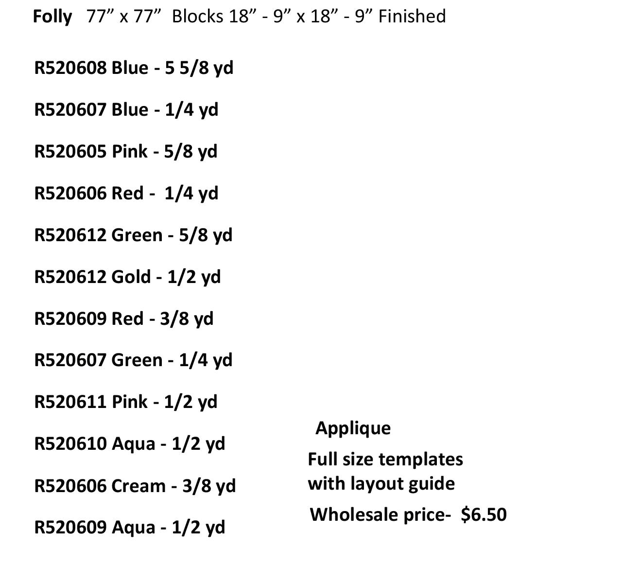 W1101-Brown F8 W1101-Green F8 W1101-Purple F8 W1102-Blue F8 W1102-Cream 1/4 yd W1102-Yellow F8 W1103-Green 1 yd W1103-Red F8 W1104-Cream 1/4 yd W1104-Green F8 W1104-Red F8