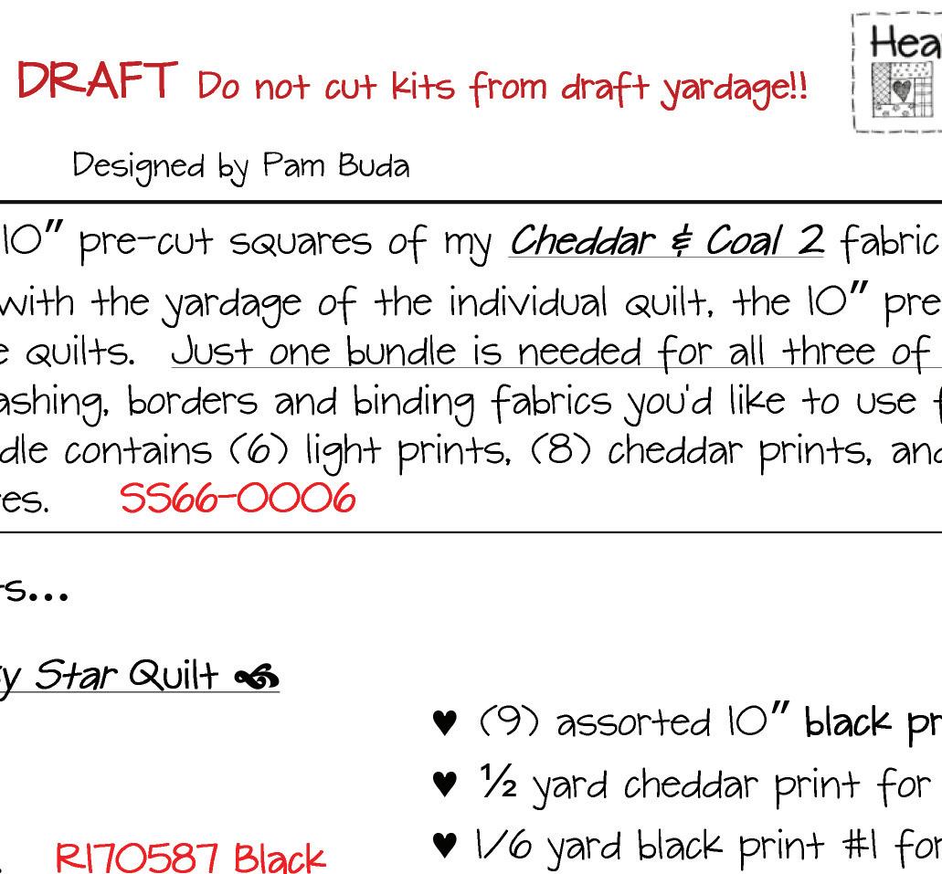 (42)10” Squares Packed 6 to a Case • March 2023 10” Squares: SS66-0006 2.5” Strips: ST66-0006 (40) 2.5” Strips Packed 6 to a Case • March 2023 Cheddar And Coal II by Pam Buda 24 SKUs • 10 yard case pack: R12E335-0240 This pattern is a future publication. While every effort is made to provide accurate yardage requirements, they are subject to change after editing. Please refer to final pa ern when ki ng. 483 BROADWAY, NEW YORK, NY 10013 1-800-548-8295 • FAX (212) 354-5245 www.marcusfabrics.com 100% COTTON • 44/45” WIDE 15 YD. PCS. D/R FACE OUT Machine Wash Cold, Mild Detergent, Delicate Cycle, Tumble Dry Low, Remove Promptly, Do Not Bleach. Card #2023-Q1-06 Delivery: May 2023