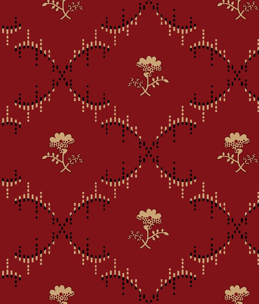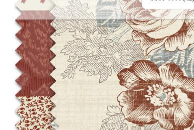 A strawberry emery is the little stuffed strawberry you find dangling from a tomato pincushion. In the 19th century, the tomato was filled with wool or cotton scraps, even horsehair or sawdust and used as a pincushion. The strawberry was filled with emery, a very fine mineral sand, that removes any bumps or burrs, and sharpens the needles. Many emeries were beautifully made of satins and velvets, and embellished with silver accents. For Pam Buda, “These highly collectible sewing basics show how ordinary items were created with extraordinary workmanship. I adore them, and they are the inspiration for my new red and black fabric collection”. There is a great variety of reds in this collection – blue reds, orange reds, deep reds.