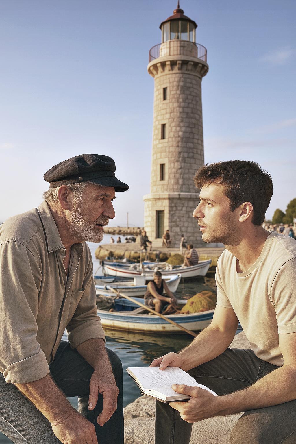 Μέσα από τη συνομιλία τους, η θάλασσα γίνεται καθρέφτης ψυχής και ο φάρος σύμβολο ζωής, γιατί κάθε φως που ανάβει δεν καθοδηγεί μόνο τους άλλους, μα κρατά ζωντανό κι εκείνον που το ανάβει.