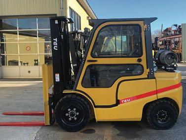 Chariot élévateur TEU PRO 30, 2022, capacité 6000 lbs, cab complète, moteur Nissan K25 au propane, pneus Softy, mat 3 sct wide view 4800 mm (188 po), side shift, positionneur classe III, fourches 48 po, 1 valve hyd, libre pour utilisation future, siège à susp.