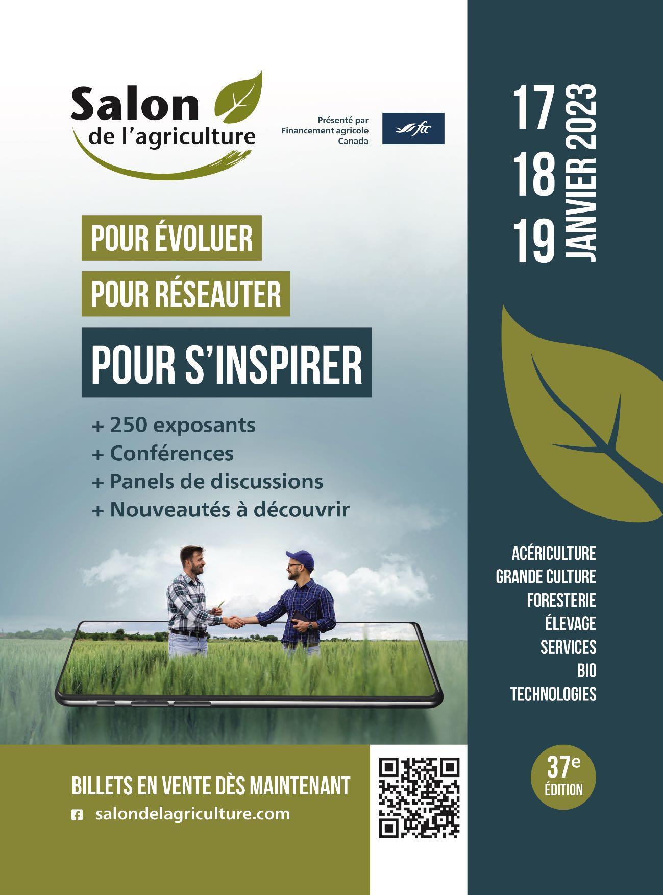 . . . . . . . . . . .64 Tuyaux André Jetté . . . . . . . . . . . . . . . . .10 WIC . . . . . . . . . . . . . . . . . . . . . . . . . . . . . . .74 INDEX Vol. 37 • No 08 • déc. 2022 / janv. 23 Ma Revue Agricole Inc. (450) 677-2556 www.marevueagricole.com info@marevueagricole.com Présidente Maude Gionet (514) 891-7190 mgionet@marevueagricole.com Directrice générale Jeannie Lemieux 514-815-7366 jlemieux@marevueagricole.com Conseillers publicitaires Nicole Varin • (514) 917-1290 nvarin@marevueagricole.com Sylvain Raiche • (819) 471-1326 sraiche@marevueagricole.com Zacharie Poudrier • (514) 216-9871 zpoudrier@marevueagricole.com Annonces classées & Abonnements Diane Soucisse Diane Soucisse – (450) 677-2556 poste 0 dsoucisse@marevueagricole.com Division Infographie Stephen Blanchette • (819) 478-2136 sblanchette@marevueagricole.com Imprimerie Imprimerie Interweb Inc.