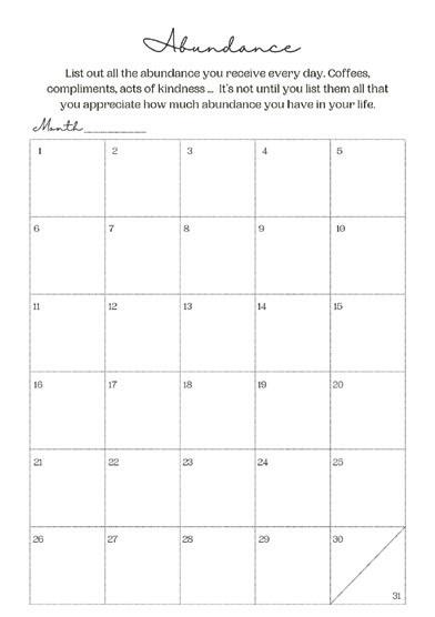 Abundance: ‘Abundance is about all the good things that come in. So somebody buys a coffee, somebody smiles at you, somebody opens the door. Something that lights you up. You think, ‘Awww, that’s so lovely.’ Someone bought you something, somebody took you out for dinner. Whatever gesture it is, you write it down,’ said Sidgwick. ‘When you’re not in a great place, you can sometimes not appreciate abundance. A couple of days go by, and you suddenly forgot that someone has bought you a coffee, or took you out. So when you write it down and see it on one page, especially people who are struggling a little bit with mental health, when you start writings these things down, you actually start thinking [positively], actually [appreciating]. Because when you bring gratitude to your life, it really does dissolve negativity.’