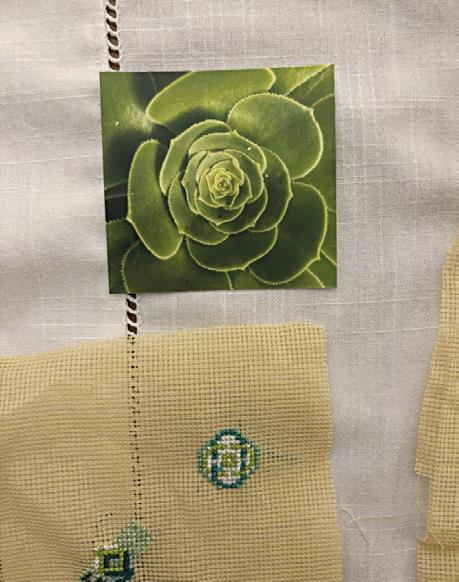 Majd Abdel Hamid, Resonance, 2025, installation including small-scale embroideries, an album containing pictures of a succulent plant, and objects displayed in a chest of drawers, variable sizes, commissioned by Mathaf. Courtesy of the artist