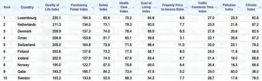 Ranked in first place is Luxembourg with a 220.1 score, followed by the Netherlands with 211.3, Denmark with 209.9, Oman with 208.9, Switzerland with 205.0, Finland with 203.8, Iceland with 202.0, Norway with 195.0, Qatar with 193.3, and Sweden with 193.2.