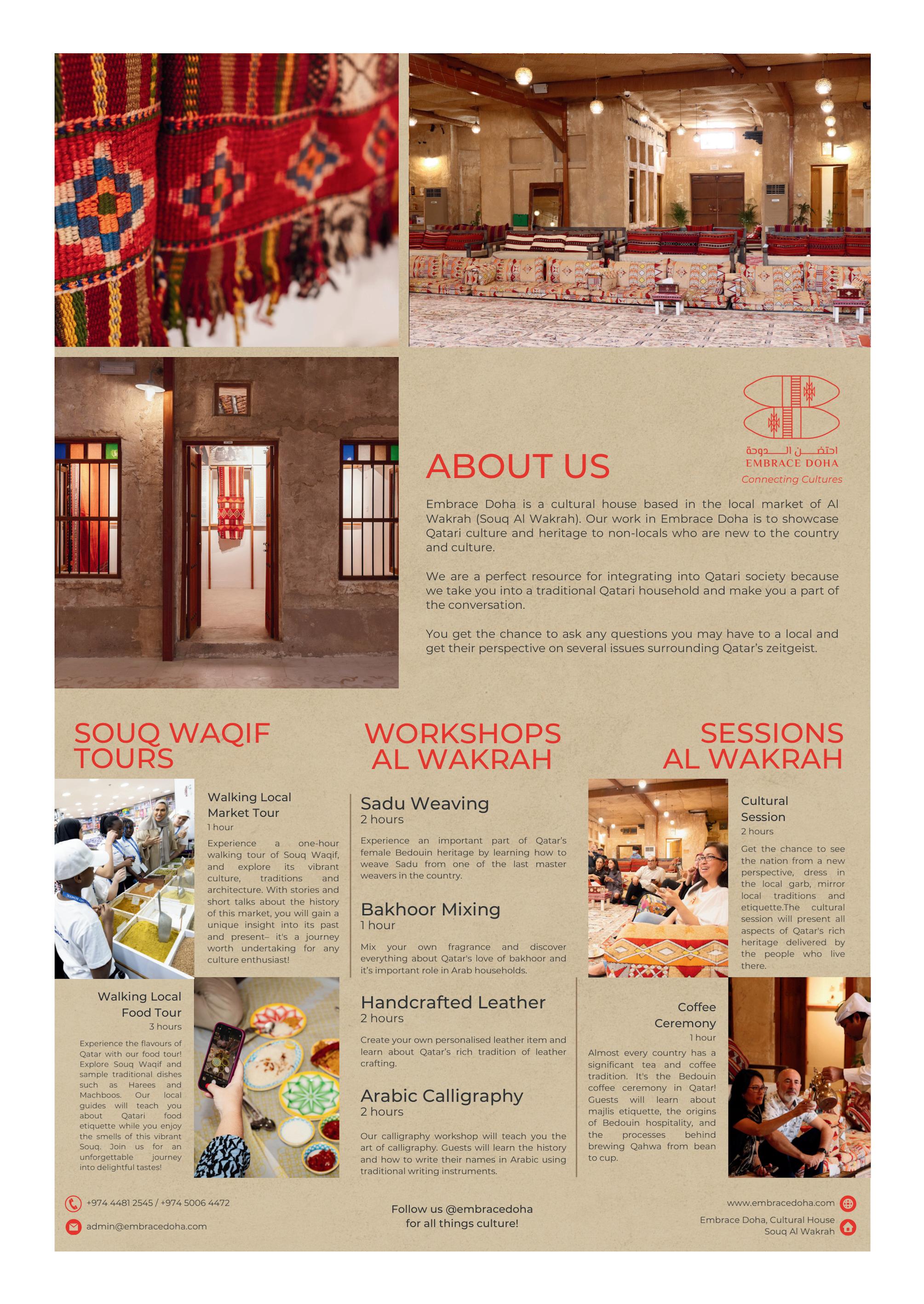 The souq or Heritage Village is designed to resemble old Qatari homes and villages. The alleyways take you to individual 'homes' that are developing into designated markets: • Women's Accessories and Perfumes • Men's Accessories • Perfumes • Nuts • Flowers and
