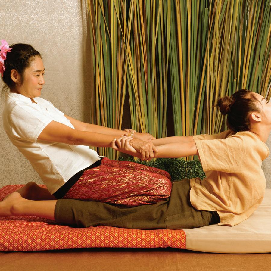 A Thai massage therapist uses their hands, knees, legs and feet to move the patient into a series of yoga-like stretches while lying on a padded mat. Acupressure, muscle compression and joint mobilisation are also used during treatment. The pressure, tension and motions created from this help the body by improving blood flow. Thai massages promote relaxation, reduce pain, improve circulation, increase flexibility and increase energy levels.
