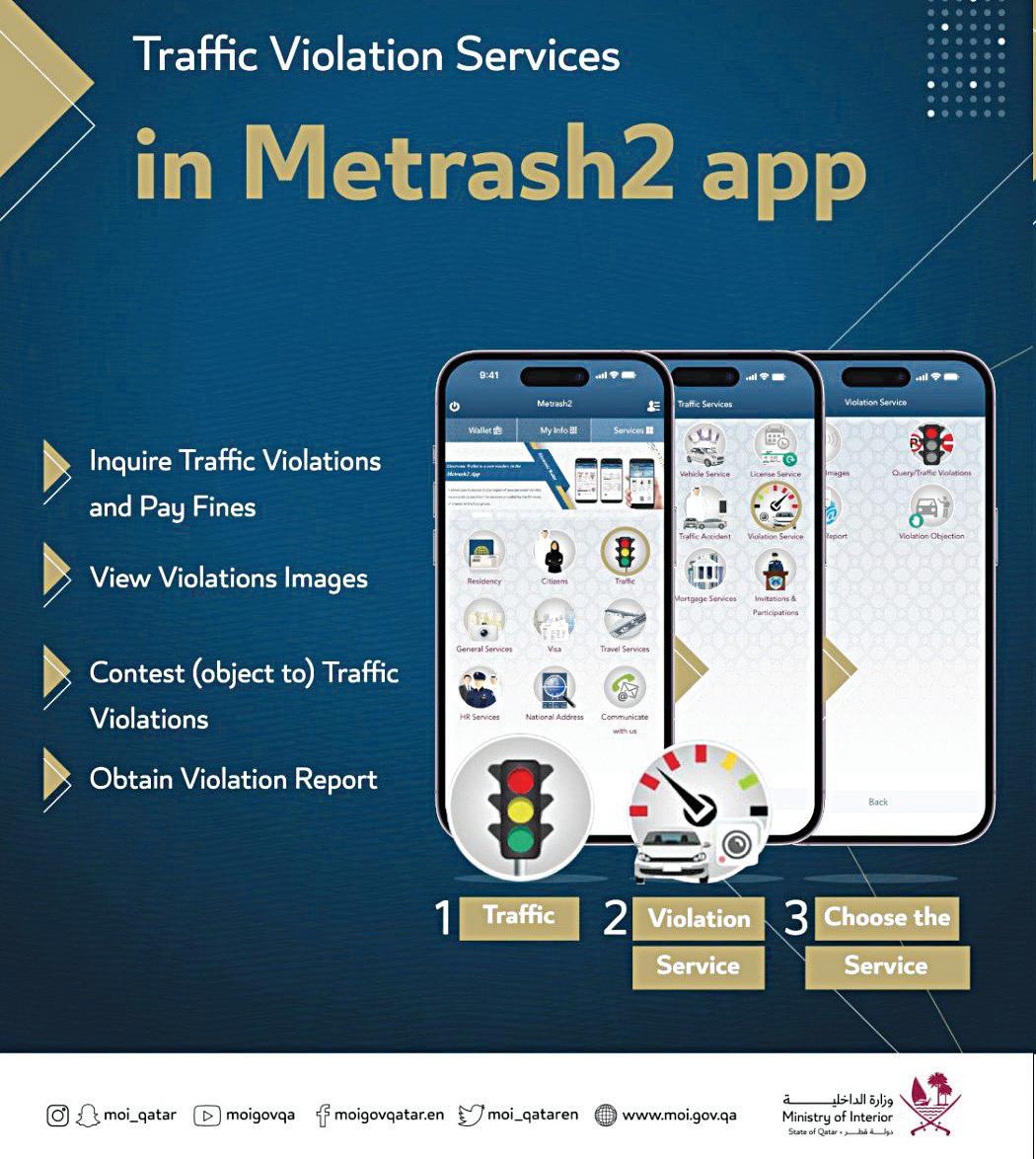 To check violations registered to your vehicle, visit moi.gov.qa, receive SMS alerts via Metrash2.