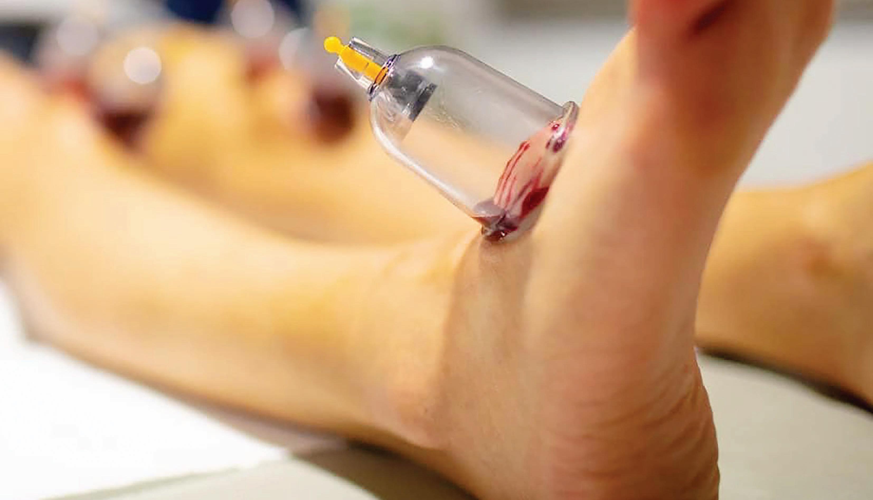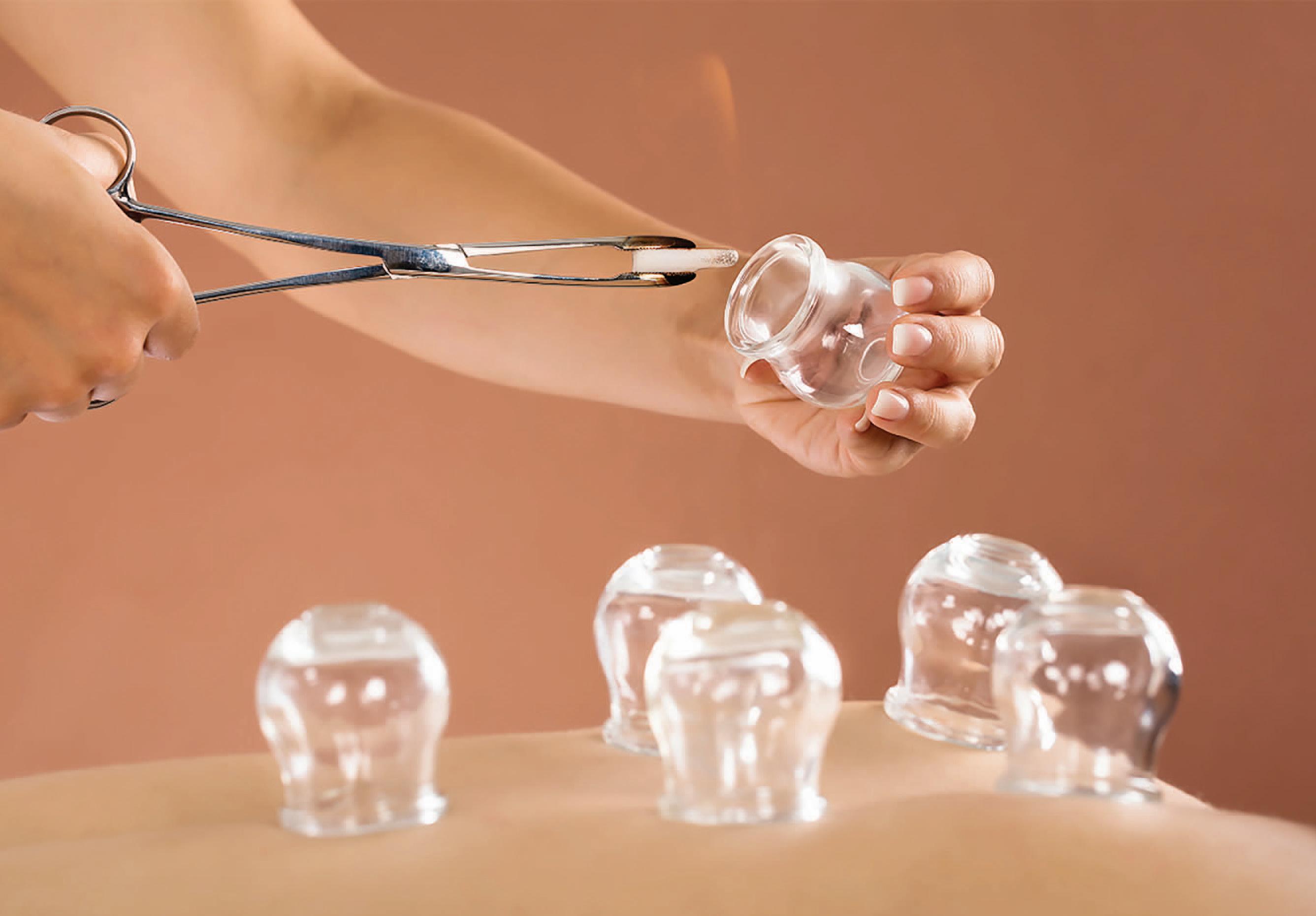 Dry: Your practitioner heats the inside of each cup. The traditional method involves setting an alcoholsoaked cotton ball aflame. The heat sends oxygen out of the cup, creating a vacuum. A more modern approach involves using a suction device to remove air from the cups. The vacuum force pulls your skin up into the cup.