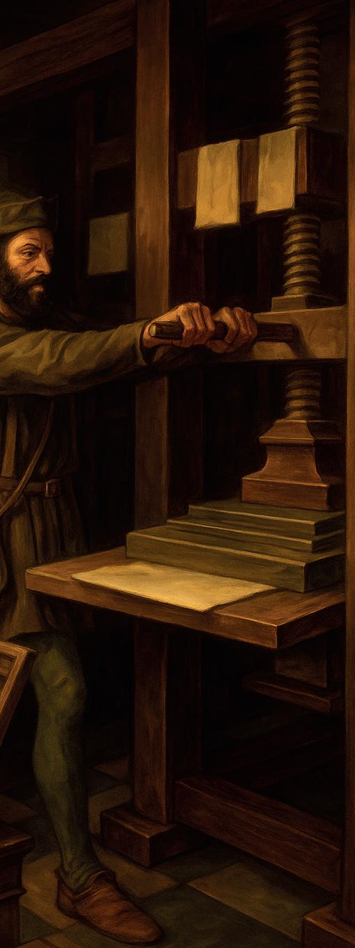 Comprender el origen y la evolución de la imprenta significa reconocer el punto de partida de la comunicación visual moderna. Antes de Gutenberg, la transmisión del saber dependía de la copia manual de los manuscritos, un proceso lento y costoso. Con la imprenta, surgió la necesidad de estructurar el espacio gráfico, de ordenar el texto y la imagen bajo principios que hoy reconocemos como bases del diseño editorial: jerarquía, legibilidad y composición.