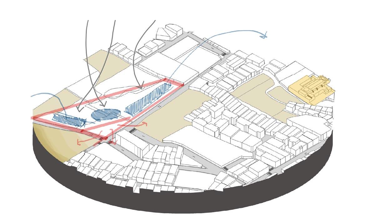 The diagram shows the land to be intervened as a void of possibilities bordered by nature but limited by the avenue that fragments said connection. With a geometry oriented to the main volcanos and the border itself, a dialogue of three volumes is reached, immersed in an existing and proposed surrounding nature.