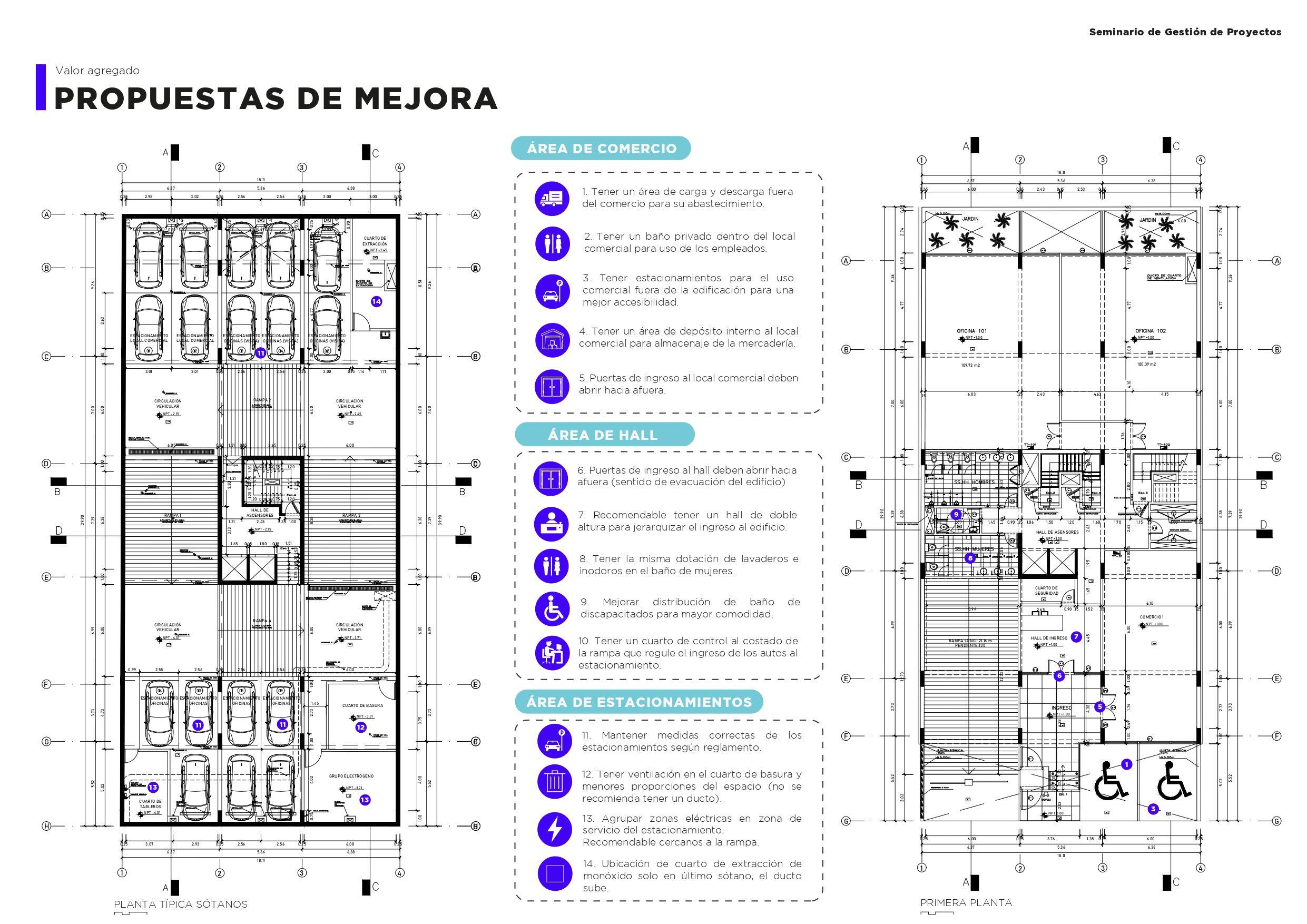 Se analizaron las plantas del proyecto y se rescataron ciertos aspectos que podrían ser mejor resueltos con respecto al diseño, organi zación y distribución. Al considerar y aplicar estas mejoras, el proyecto ganaría un valor extra ya que se tendría un mejor funcionamien to del mismo.