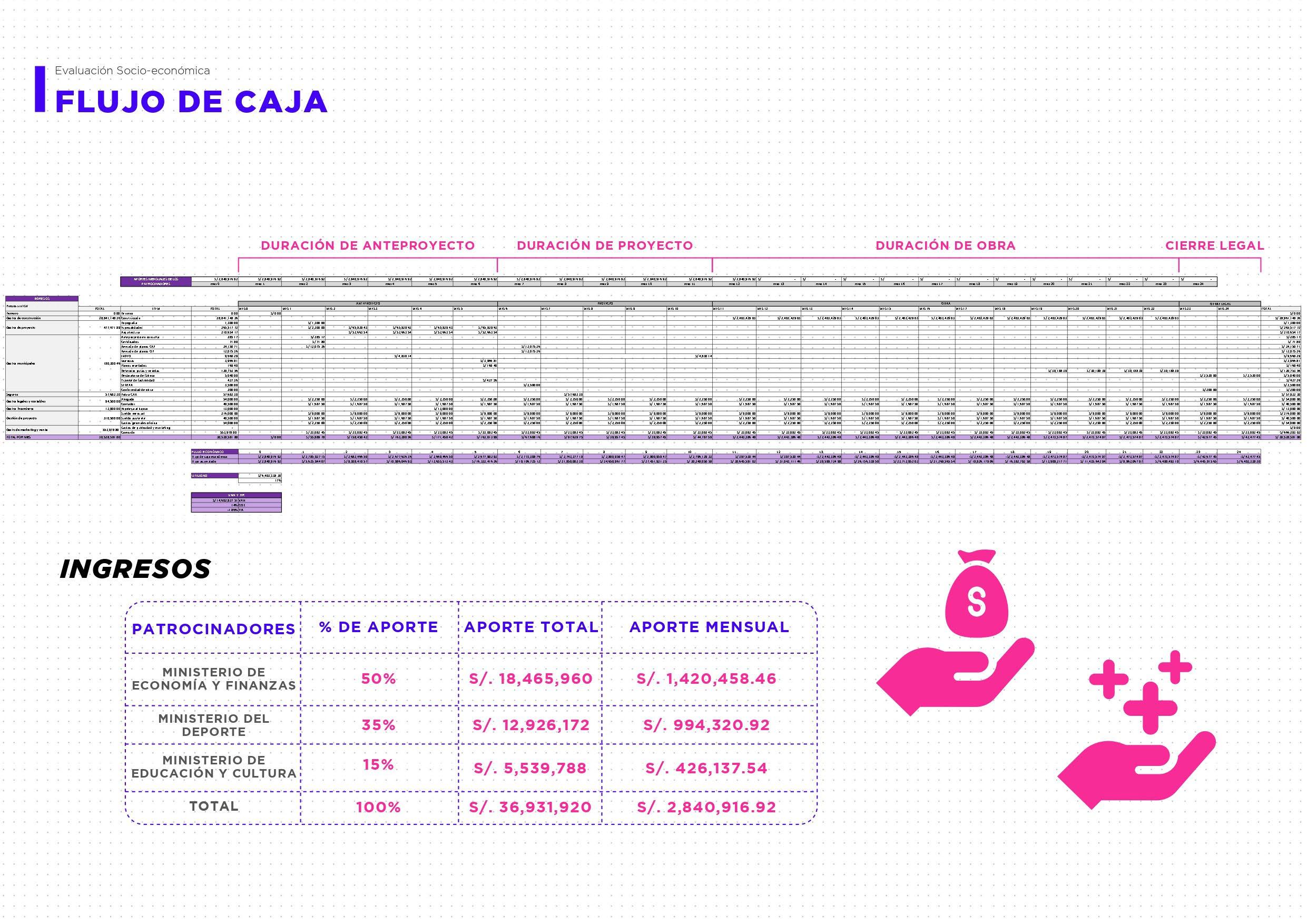 Se definió un tiempo de dos años donde se realizara el anteproyecto, proyecto, obra y cierre legal. Asimismo, se calcularon los resulta dos del VAN y la TIR, donde el primero rodea, aprox., los 14 millones; por otro lado, la TIR resulta -1.86%. Esta valor podría incrementar si se prolonga el tiempo durante el flujo de caja y se buscan otras fuentes de ingreso; sin embar go, al tratarse de un proyecto socual, es normal que este valor resulte negativo.