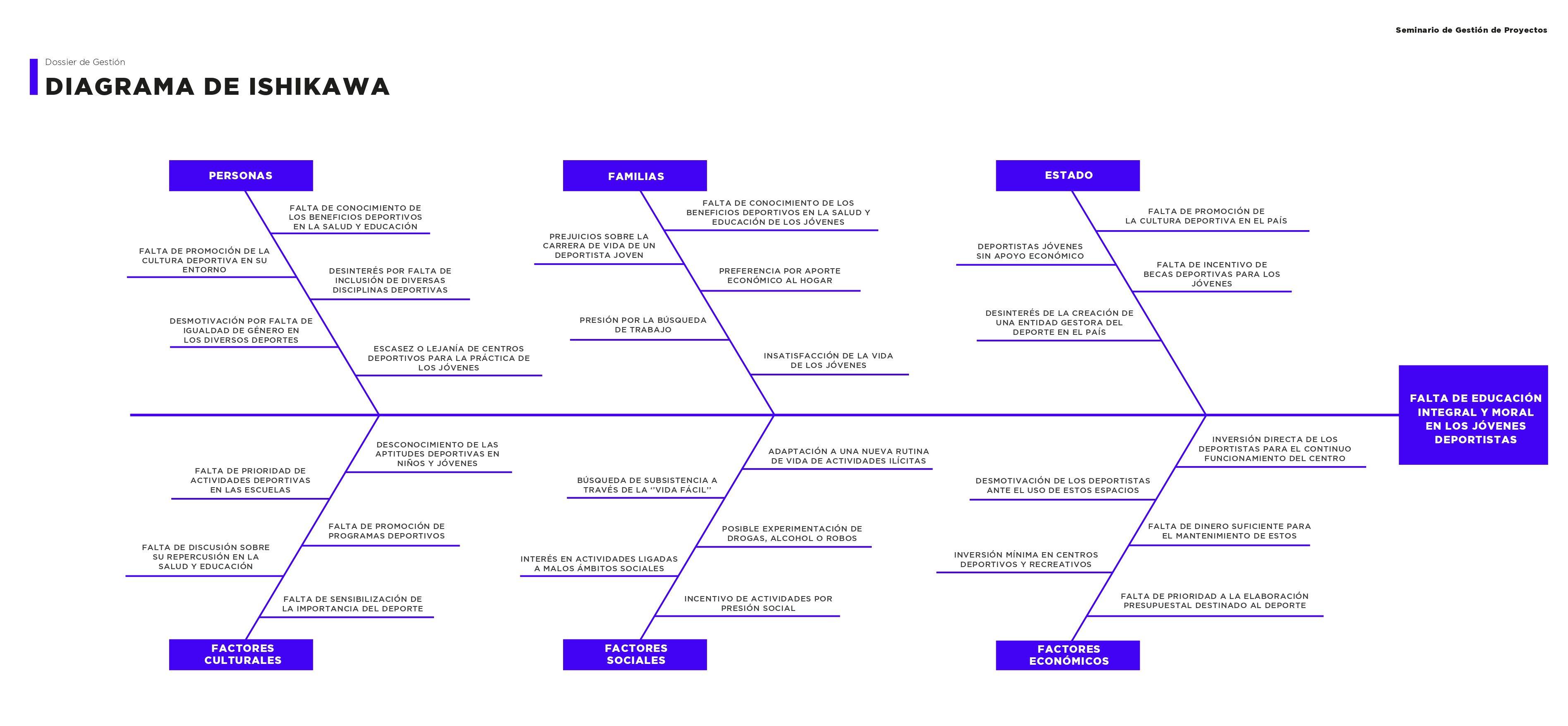 En este diagrama se reconoció el problema y este fue desglosado para entender las causas y efectos. A partir de esto, se puede entender la raíz del problema y se puede entender desde que punto atacarlo, en nuestro caso, nuestro problema era: la falta de educación integral y moral de los jóvenes deportistas.