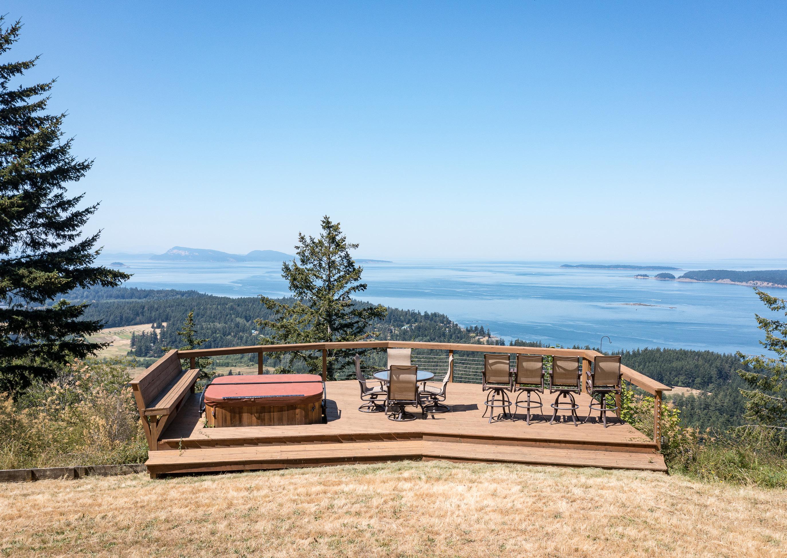 Secluded 5-AC, comprised of main house, guest house, w/ vacation rental permit, detached garage w/ studio space above. Breathtaking 180-degree views of the San Juans, Canada and spectacular sunsets from the home, guest house and decks. Top quality finishes within the 2 BD 1 ¾ BA main house, w/ finished basement for heated storage below. Chef’s kitchen with granite counters. Relax in the living room taking in the expansive views from the floor to ceiling windows. Enjoy a movie via the home theater system w/ projection screen above the stone fireplace. 2nd floor primary suite w/ soaking tub and walk-in shower. Fenced garden area w/ raised beds. Below the main house sits a large viewing deck, complete w/ hot tub. #1961932
