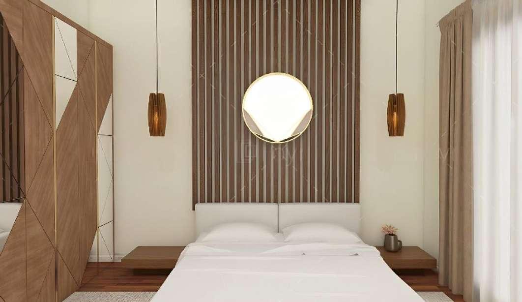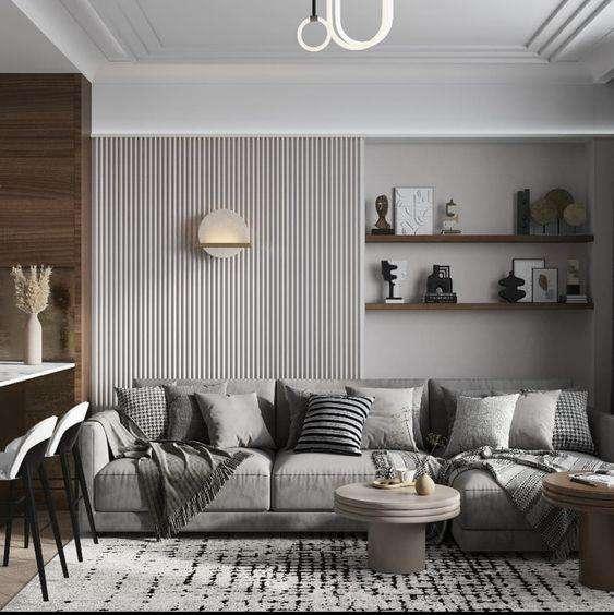 Fluted wall panels for the accent walls, Scandinavianstyle furniture and accessories add comfort yet style. Warm colors for the color palette of the scheme.