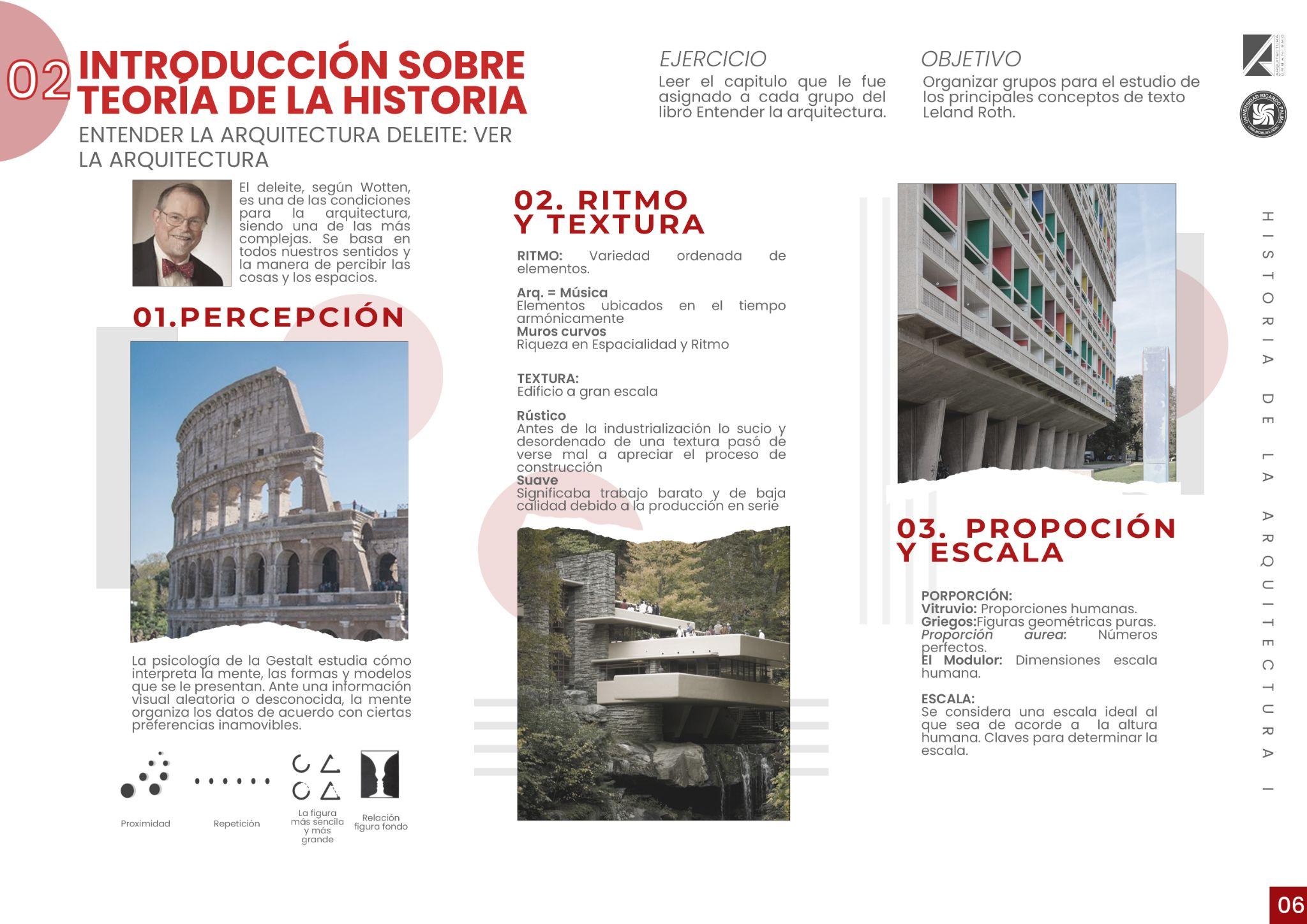 02.RITMO TEXTURAY02 03 RITMO: Variedadordenadadeelementos. Arq.=MÚSICA: Elementos ubicados en el tiempo armónicamente. TEXTURA: Edificioagranescala. RÚSTICO: Antes de la industrialización lo sucio y desordenadodeunatexturapasódeverse mal a apreciar el proceso de construcción. SUAVE: Significaba trabajo barato y de baja calidaddebidoalaproducciónenserie. COLORYTEXTURA INTRODUCCIÓNSOBRETEORÍADELAHISTORIA ENTENDER LA ARQUITECTURA DELEITE :VER LA ARQUITECTURA 6