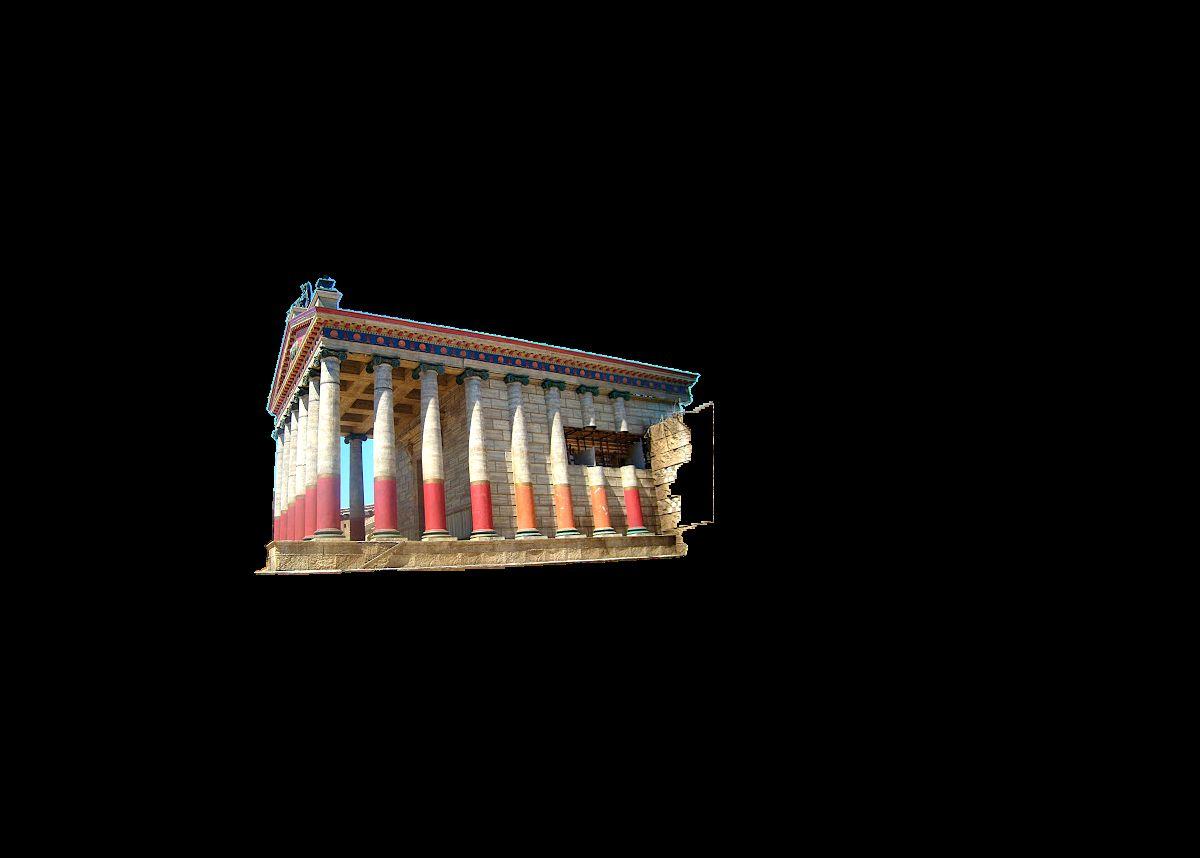 columnasDeordenjónicoconsuscorrespondientesvolutaslaterales,pasandelaverticaldelasalahorizontaldelacornisaylabasedelfrontón.