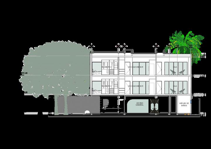 Se diseñó un acceso vehicular para vehículos y camiones de carga y descarga; sin embargo, para los camiones se integró una caseta de acceso y salida exclusiva para ellos, dicho paso dirige a los camiones a un patio de maniobra que permite transportarlos hacia el centro de acopio o al cuarto de basura para después salir por el otro carril de esa misma esquina.