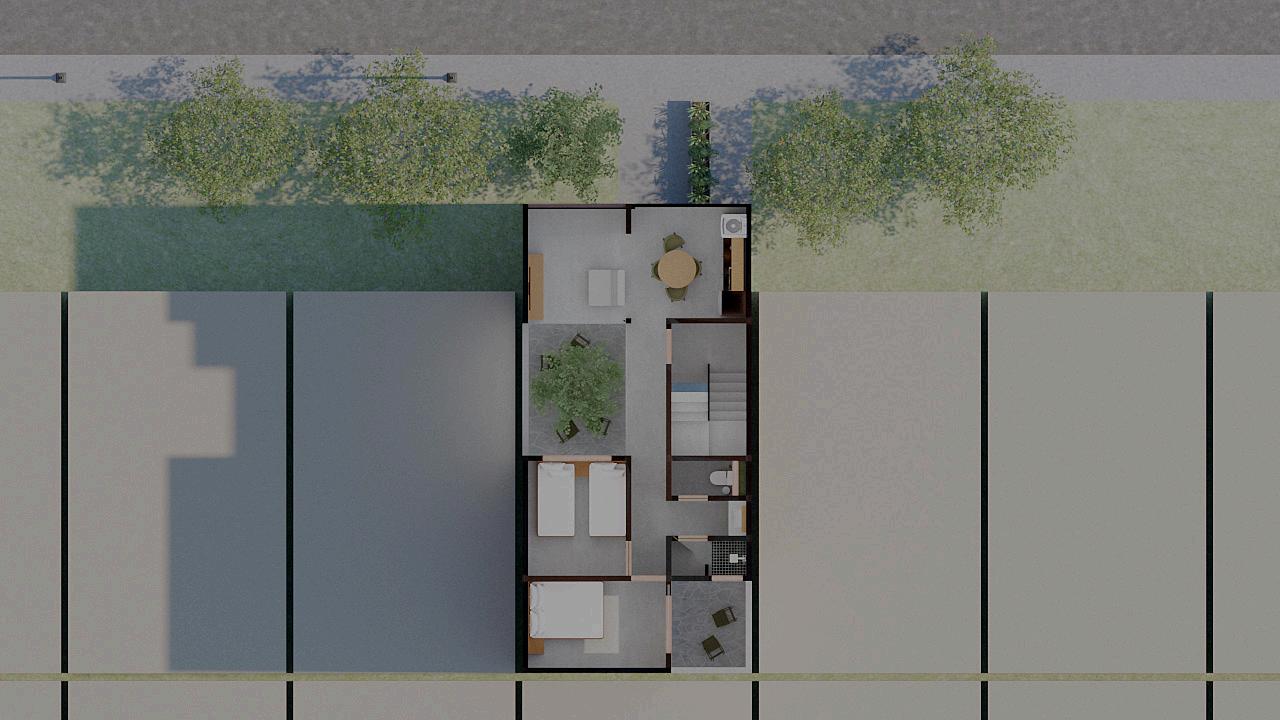 1. Zonificación del volumen: Se dividió el conjunto en dos secciones principales. La parte frontal está destinada a las áreas de convivencia, promoviendo la interacción social y el aprovechamiento del espacio común. Mientras que la sección posterior esta destinada a los dormitorios y el baño, priorizando la privacidad y el descanso.