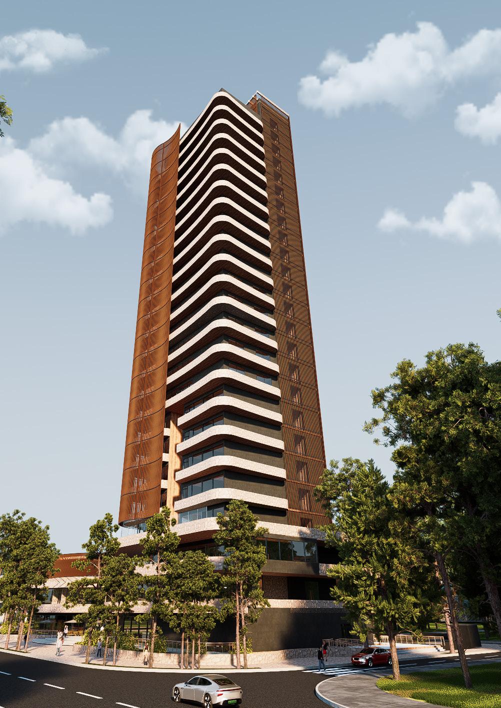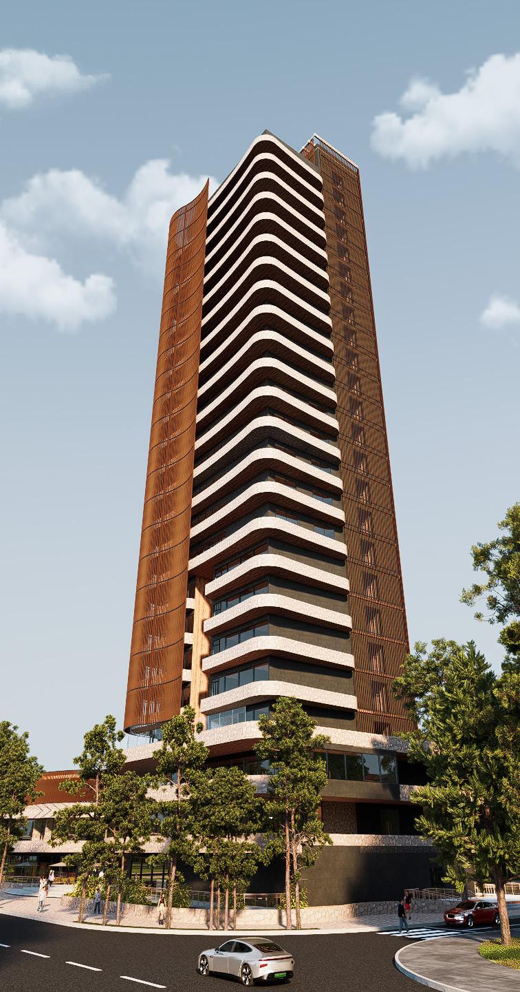 This project, located at Cristo Redentor Avenue and 4th Ring in Santa Cruz de la Sierra, features an organic design that adapts to the site’s geometry with curved podium entrances, perimeter balconies, and a contrasting rectangular crown. Sustainable strategies include a double-skin façade, cascading vegetation, solar panels, vertical gardens, and low-carbon materials, all aimed at reducing energy demand, improving comfort, and integrating the building with its context.